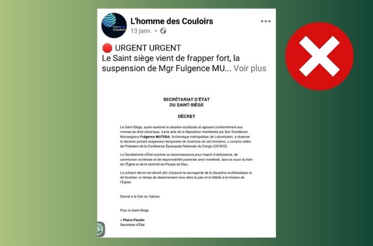 🎧 FAUX ! Le Vatican n’a pas suspendu Fulgence Muteba de ses fonctions d’archevêque de Lubumbashi et de président de la Cenco9 février 2026 : En RDC, les réseaux sociaux ont été secoués, fin janvier, par l’annonce de la suspension de Monseigneur Fulgence Muteba de ses fonctions de président de la Conférence épiscopale nationale du Congo (CENCO) et d’archevêque de Lubumbashi. Les publications consultées (ici, ici et là notamment) s’accompagnent, pour certains, d’un prétendu décret de la secrétairerie de l’Etat […]