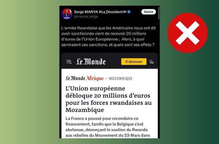 🎧 Attention ! Une vidéo de chauffeurs en grève détournée en fausse manifestation politique24 mars 2026 : Le 16 mars, un compte X identifié sous le nom de Dr Dash a publié une vidéo montrant une manifestation de protestation qu’elle a attribué aux travailleurs du secteur de transport à Kinshasa qui exigeraient la démission du président Félix Tshisekedi pour incompétence. La vidéo est réelle, mais sortie de son contexte. Décryptage. Des pneus […]