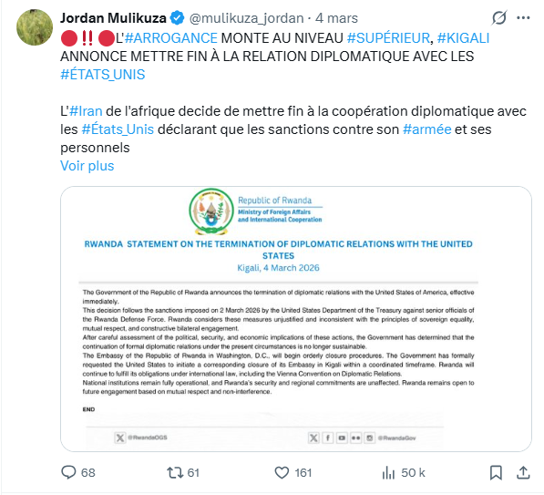 Le post est accompagné d’un communiqué du bureau de la porte-parole du gouvernement rwandais publié à la même date et exprimant le regret du Rwanda face aux sanctions américaines qualifiées d’« injustes ». Au 12 mars, la publication avait été vue par plus de 46 000 internautes et partagée 122 fois sur le réseau social X.