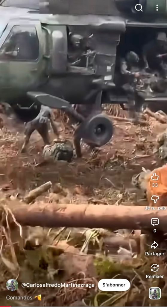 Dans la vidéo : un hélicoptère militaire de type Black Hawk en vol stationnaire très bas au-dessus d’une zone boisée et des militaires qui sautent pour sécuriser la zone. Des éléments qui cadrent avec le contexte des combats dans l’Est de la République démocratique du Congo, où l’armée régulière s’oppose aux rebelles de l’Alliance fleuve Congo – Mouvement 23 mars (AFC/M23), soutenus par le Rwanda.