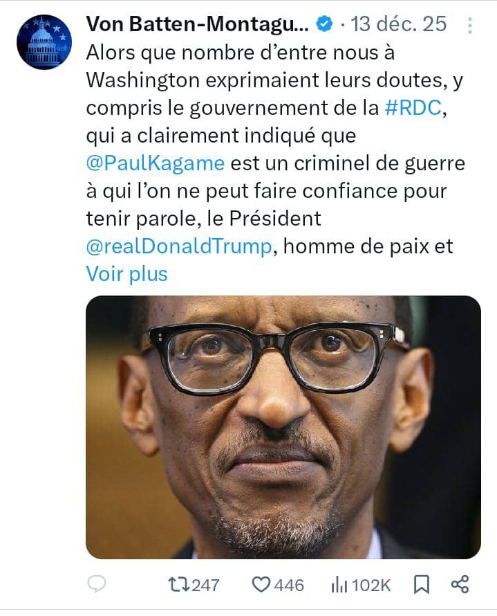 « Alors que nombre d’entre nous à Washington exprimaient leurs doutes, y compris le gouvernement de la RDC, qui a clairement indiqué que @PaulKagame est un criminel de guerre à qui l’on ne peut faire confiance pour tenir parole, le Président @realDonaldTrump, homme de paix et véritable défenseur de la fin des conflits, a choisi de donner une chance à #Kagame », a écrit Von Batten le 13 décembre sur X.
