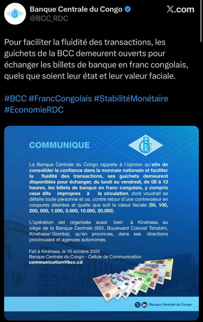Ces posts ajoutent qu’à partir du vendredi suivant, il serait « trop tard » pour changer les devises, et que des amendes allant jusqu’à un million de francs congolais seraient infligées à quiconque serait trouvé en possession d’une monnaie étrangère.